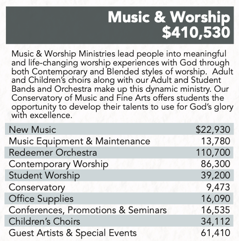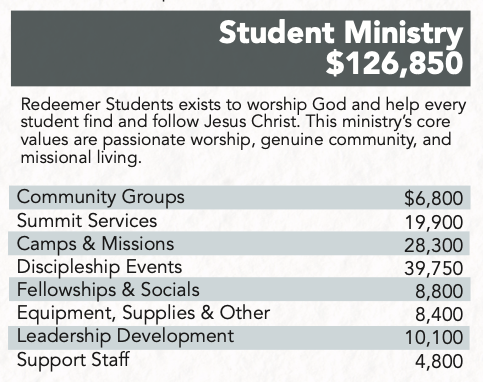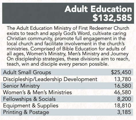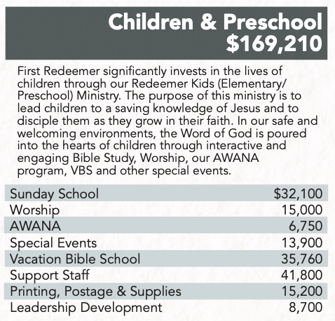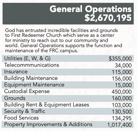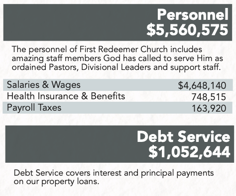This website summarizes how we will steward our resources to share the hope-giving truth about Jesus with everyone possible during the coming year. As you can see, our 2025 spending plan aims to glorify God with a tenacious commitment to the Great Commission. We are grateful for God’s gracious blessings, and, at the same time, we are mindful that to whom much is given, much is required. My prayer for the First Redeemer family is that we always steward well our God-given blessings for our God-given purpose.