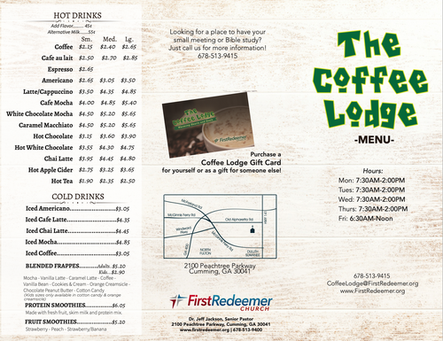 **The Coffee Lodge will be open on Wednesdays from 5pm-7pm for fellowship, but there will be be no food or drink service.